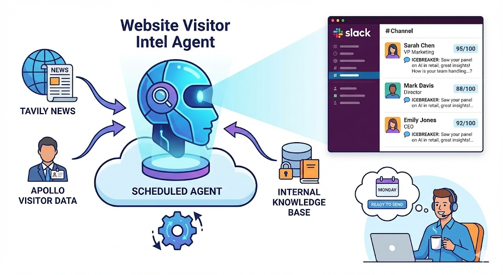 On your schedule, this agent wakes up, pulls decision-makers who visited your site (via Apollo), and runs a full research loop on each one—cross-referencing news via Tavily and checking your internal knowledge base for relevant context.